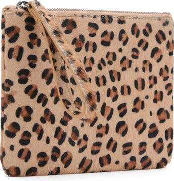 A fierce leopard pattern highlights the slim profile and genuine calf-hair exterior of a compact pouch perfect for storing your small essentials while on the go.