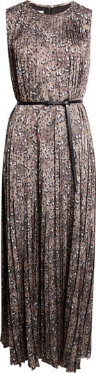 Leopard Print Accordion Pleat Belted Satin A-Line Dress