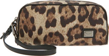 A bold leopard print found in nature and heavily used by the Italian label puts the 'fun' in this functional dopp bag fitted with a leather wrist strap.