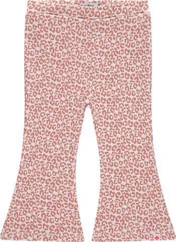 This ribbed legging features an allover pink-toned leopard print and a flared leg silhouette.