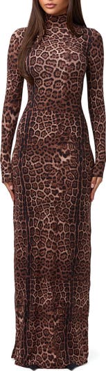 Leopard Print Long Sleeve Body-Con Maxi Dress
