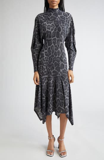 Leopard Print Long Sleeve Handkerchief Hem Dress