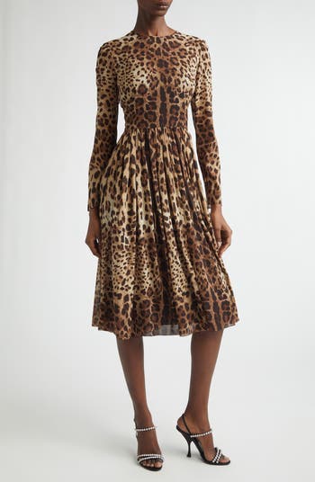 Leopard Print Long Sleeve Stretch Silk Midi Dress