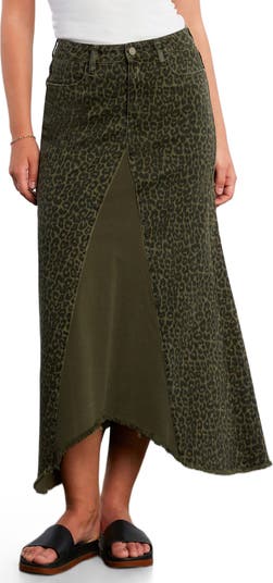 A skirt to set your your inner flower child twirling is spliced from solid and leopard-print denim that's finished with a fluttery, frayed hem.