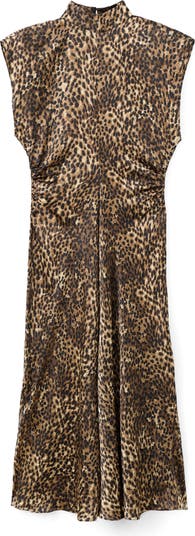 Slight sleeves frame this rich satin maxi covered in striking leopard spots and accented with rippled waistline ruching.
