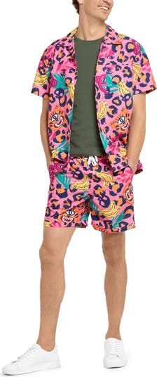 Make an entrance even when you're outside in this color-explosion camp shirt and matching shorts made of velvety fabric that keeps you as comfortable as you are cool. The shirt works on its own or layered and unbuttoned, while the shorts feature an elastic waist that lets you move and relax with ease.
