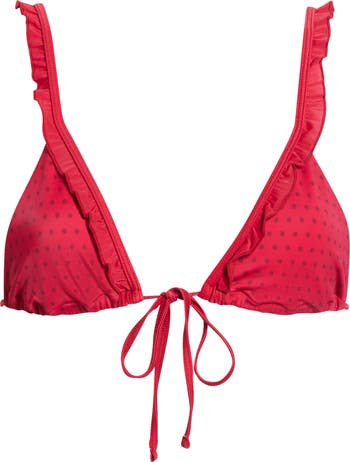 Flirty ruffles and a playful print bring the beach-ready vibes to this tie-front bikini top.