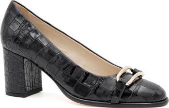 Polished bit hardware highlights the croc-embossed leather upper of an Italian-made pump set on a foam-cushioned footbed and wrapped block heel.