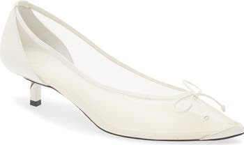 A breezy mesh upper brings a touch of peek-a-boo allure to a bow-detailed pump framed with a pointy toe and twisted heel.