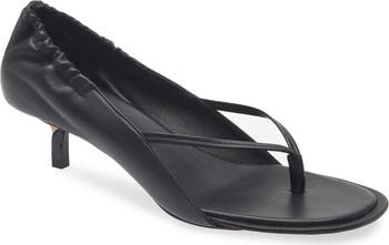 Slender thong straps define this pump/sandal hybrid fitted with an elasticized topline at the heel to prevent slippage and set on an innovative kitten heel with a literal twist.