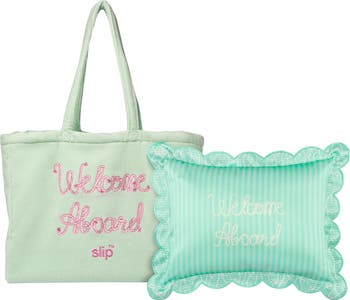 What it is: A limited-edition set featuring a scalloped-edge travel pillow with a removable silk case and a beach bag, too.