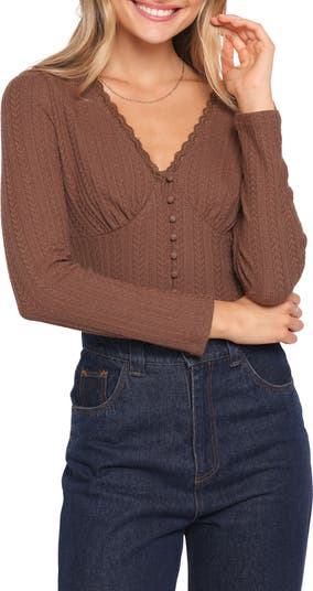 A deep V-neckline and covered front buttons lend soft allure to this ribbed-knit crop top designed to skim the body with subtle definition.