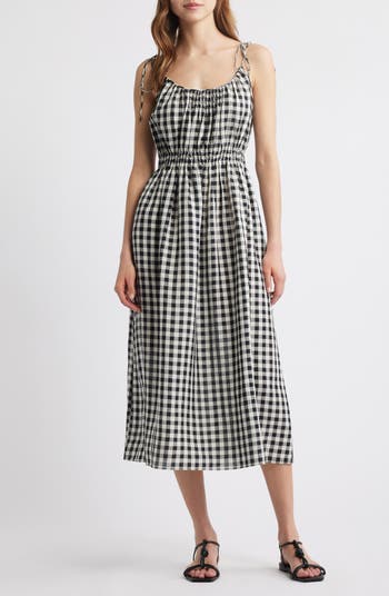 Breeze through sunny weekends and vacay plans in this linen-enriched maxi dress rooted in the cult-favorite Cali label's retro/romantic aesthetic. Nostalgic gingham and decorative smocking sweeten the look.