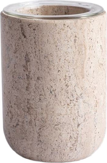 This piece is made of travertine marble. Inside is a borosilicate glass container that you can insert and extract. Store toothbrushes or all kinds of bathroom goods, giving it a beautiful view in your place. This maker is PBP Verified™ and follows the responsible and transparent production practices as defined by Powered by People’s sustainability standards.