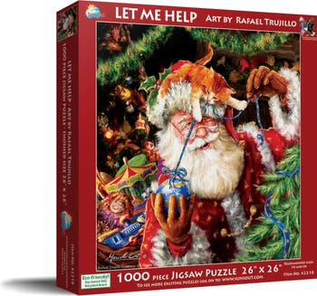 "Let Me Help!" 1000 piece jigsaw puzzle transports adults into an enchanting Christmas scene designed by renowned artist Rafael Trujillo. The beautifully detailed, fully licensed artwork is composed into a vivid and charming Christmas scene which evolves as every puzzle piece is placed. With a complete size of 26" x 26", the puzzle proves to be engaging and doubles as a striking piece of art. Proudly made in the USA by SunsOut Puzzles, these finely crafted puzzles are composed of high-quality recycled cardboard ensuring both durability and ease of handling. The testament to SunsOut’s eco-friendly practices lies in their utilization of soy-based inks and top-quality recycled-board materials; their commitment to sustainability evident in every facet of the puzzle. Customer satisfaction is guaranteed by SunsOut, as they stand behind their products and offer responsive customer service for any missing or damaged pieces. The joy of triumphing over the challenge brought by the puzzle can be shared with friends and family, as its creation provides a chance to form memories and enjoy quality time together. Perfect for a gift or a cozy winter night's activity, the Let Me Help! Puzzle, from SunsOut, is the optimum choice for its quality, beauty, and commitment to sustainability.
