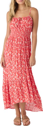 Smocking at the waist shapes a sunshine-ready floral dress cut from a lightweight, textured crepe with a flouncy midi-length hem.