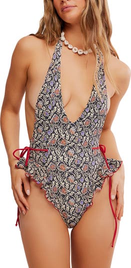 Feel your most stunning as you lounge in the sand wearing this plunging one-piece swimsuit featuring high-legs trimmed with fluttery ruffles.
