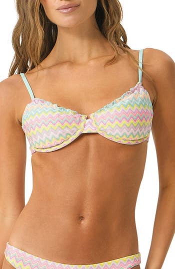 A metallic chevron print makes you shimmer like the sun in this underwire bikini top finished with flirty lettuce-edge trim.