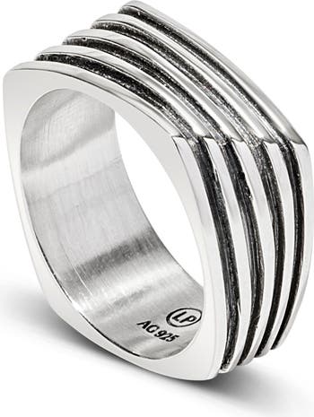 This oxidized and polished shed textured statement ring is handcrafted using the finest sterling silver. Silver and black lines make up this elevated edgy ring. Wear solo or stacked with other items of the collection to add a unique 3 dimensional accent to the look. | o Approx. 8.5 mm o AG 925 Sterling Silver o Finish: Oxidized & Polished o Nickel free o Handcrafted in Korea