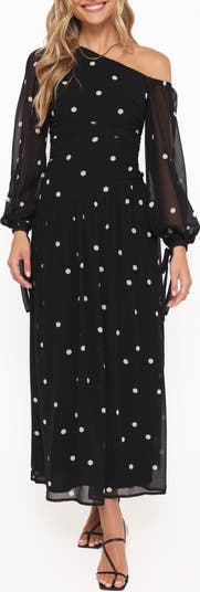Pretty polka dots detail this one-shoulder maxi dress detailed with sheer puff sleeves, a ruched bodice and a ruffled skirt.