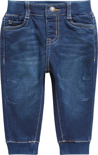 Give your kiddo's style a dash of rugged charm with these comfy denim-style joggers featuring an elastic waistband and ribbed cuffs.