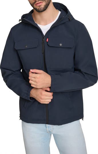 Keep the rain at bay while heading to work or running errands in this hooded rain jacket with a generous fit for layering and front zip pockets to keep your essentials secure.