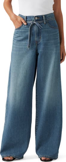 Turn heads in these floor-sweeping jeans cut from linen-kissed nonstretch denim in a loose silhouette with a belt securing the waist and roomy straight legs for effortlessly cool style.