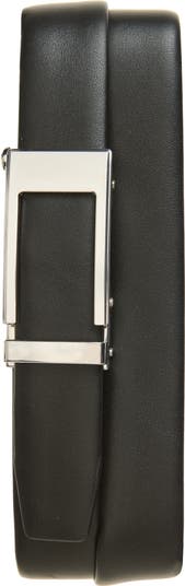 A glinting buckle lends modern appeal to a handsome belt crafted from softly pebbled leather.