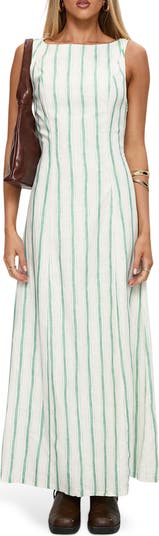 Spirited stripes enliven this crisp linen-blend maxi made with a slender back tie to shape the silhouette.