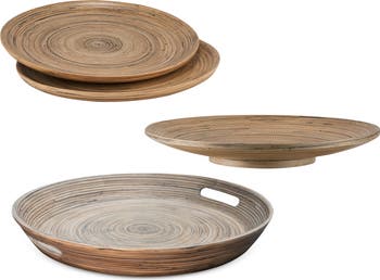 For generations, our products have been handcrafted by female Vietnamese artisans —creating pieces that are not only beautiful but deeply rooted in tradition. Lexa handcrafted products reflect this heritage, blending time-honored techniques with modern sustainability. Made from 100% natural materials, each purchase supports artisan communities and helps reduce plastic waste.\nEach product is a true original. No two are ever exactly alike, thanks to the natural variations of the material and the artisan’s hand. Slight imperfections add to their charm, showcasing the uniqueness and authenticity that mass-produced products simply can’t match. Lightweight and shatter-resistant, these products are designed for real life—durable enough for daily use, yet elegant enough to showcase in your home.\nUpgrade your hosting ensemble with the LEXA 4-Piece Serving Set, a coordinated collection designed for versatility, style, and everyday functionality. The extra-large 16" serving tray with handles provides ample space for drinks, snacks, or decorative displays, making it ideal for parties, holidays, and casual gatherings. Complementing it are two sleek 12" trays, perfect for coffee service, cheese boards, or festive spreads, adding natural warmth to any table. Completing the set, the 12" footed plate works as a stylish serving piece or decorative accent—great for pastries, charcuterie, centerpieces, or everyday use. Together, these thoughtfully crafted pieces bring refined, organic charm to both entertaining and home décor.