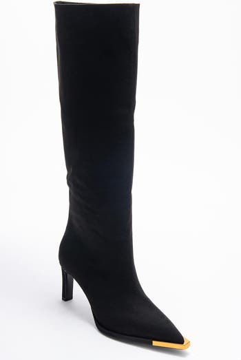 A sophisticated knee-high silhouette with refined gold accents and a pointed toe that elevates any ensemble