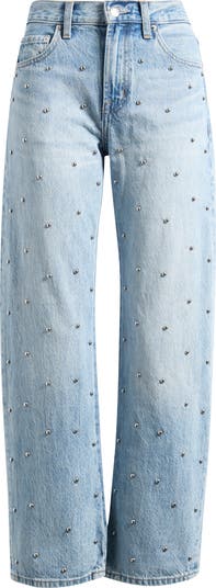 Enliven your casual look with these relaxed-fit, nonstretch jeans that curve out slightly at the knees and are embellished with polished stud accents.