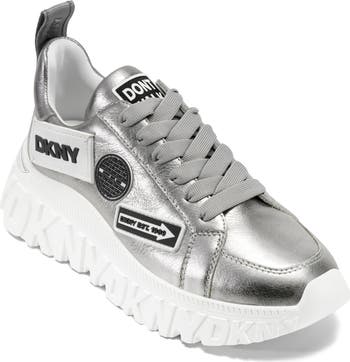Logo patches and a glossy metallic finish add plenty of street-savvy style to this lace-up platform sneaker.