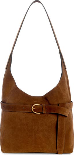 An adjustable belt strap with brushed-finish hardware cinches the topline of this superspacious bucket bag made from rich tumbled suede.