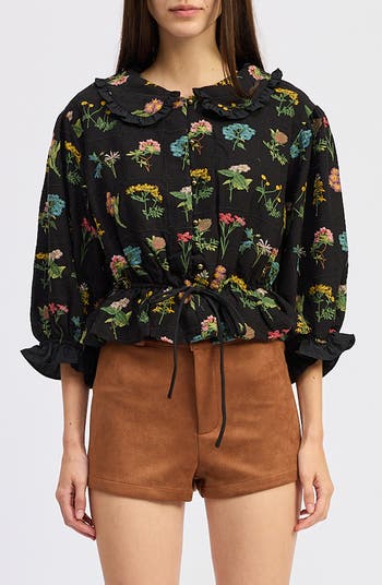 A drawstring waist creates a flouncy peplum that furthers the sweet look of this button-up shirt adorned by colorfully embroidered blooms.