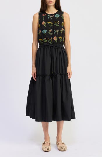 A flowery stitched bodice sweetens this sleeveless midi made with a defining waist tie and finished with a flouncy tiered skirt.