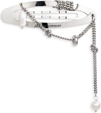 Artfully adorn your tresses with this French-made hair clip that catches the light with glossy faux pearls and a swinging chain.