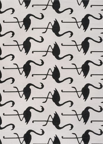 The bold pattern of this classic rug is inspired by the heyday of Florida style. It's made from durable synthetic fibers woven into rows of tropical flamingos. Use this stylish rug outdoors, or in the bedroom, living room or dining room.