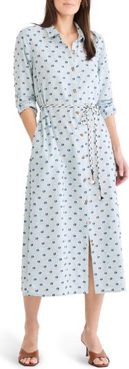 Classic styling gets a sporty twist in this midi shirtdress cut from stretch fabric with an allover clip-dot motif. Roll-cuff sleeves and a shoelace belt add a casual, athletic inspired touch to the timeless button-up silhouette.