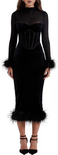Wispy feathers trim this corset-inspired midi dress made from ultrasoft stretch velvet and designed with powermesh contrast for extra support.