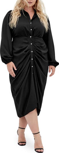 Dramatic gathering at the front creates the sophisticated silhouette of this long-sleeve dress complete with an attached sash that cinches at the waist.