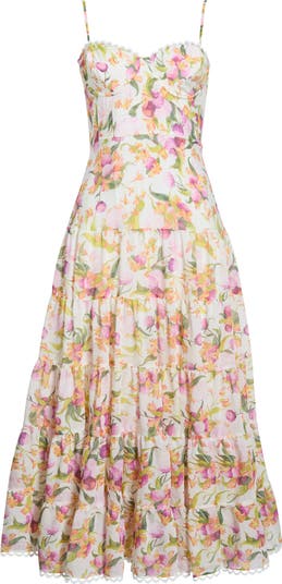 Bustier-style sweetheart cups and delicate scallops tracing the neckline and hem emphasize the garden-party romance of this tiered maxi sundress covered in vivid blooms.