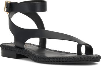 An asymmetric strap and single toe loop add subtle dimension to a sleek leather sandal secured by an adjustable buckle closure.