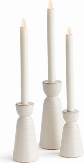 The Libbey Stoneware Taper Candle Holders, Set of 3, feature sleek shapes and a premium glaze finish for timeless style. Perfect for dining tables, mantles, or shelves, they hold standard taper candles and add elegant height and warmth to your home décor year-round.