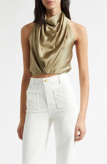 Cut from rich stretch silk, this glossy cropped top is meant to show off your shoulders and back.