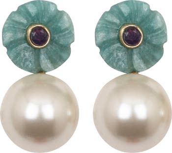 Carved amazonite flowers with contrast crystal centers bring rich color to these handcrafted earrings finished with Austrian crystal pearl drops.