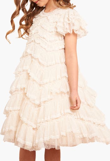 The Libby Lace KIDS Dress in Cream. This statement dress has been designed with gently gathered tulle frills in soft zig-zag borders and delicate lace trims. Beautifully crafted with layers of signature tulle, creating a frothy, elegant style. Let your little one take centre stage in this magical piece.