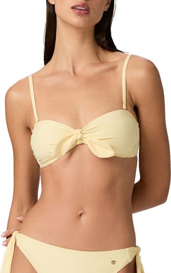 A knotted front tie centers this bandeau bikini top designed in stretchy, quick-drying fabric with removable soft cups for confident coverage made for long, sun-soaked afternoons.