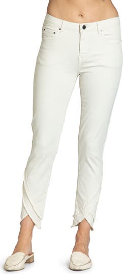 Asymmetric frayed hems amplify the modern appeal of stretch-kissed jeans designed in a skinny fit for trendsetting allure.