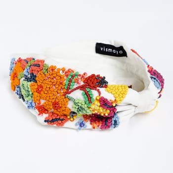 Treat your tresses to a touch of liberty in this funky headband! With its cool white knotted center and multicolor embroidered flower designs featuring bead and sequin accents, this floral headband is definitely one to wear with confidence!